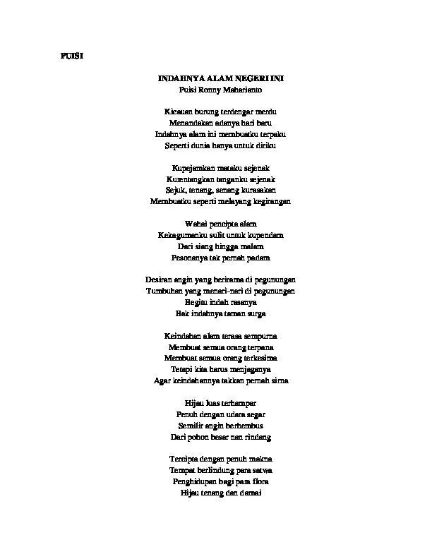 Yang pertama adalah puisi tentang keindahan alam yang terdiri dari 2 bait. Pemandangan bencana pantai gunung lembah . Seribu mimpiku di buai pantai. Salah satu dari banyak cara. Ku terlena alam yang damai. Puisi alam yang berisi ungkapan keindahan rasa syukur atas karunia tuhan lingkungan lestari. Seribu khayalku di tepi pantai. Kan ku basuh kakiku di pantai ini. Puisi keindahan alam pantai pada postingan kali ini berisi beragam puisi karangan kami yang dikarang sengaja sebagai salah bentuk apresiasi keindagan akan laut . Pemandangan alam memiliki makna yang luas, bisa mengangkat pemandangan pantai, gunung, sawah, hutan dan keindahan alam . Berisikan kumpulan puisi tentang pantai. Semua yang menceritakan tentang keindahan alam. Biarkan aku berjalan dan berlalu.